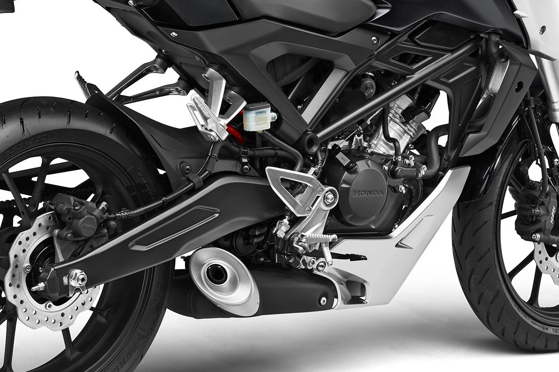 Ein innovativer, auch optisch attraktiver Rahmen kombiniert Stahlrohr und Formteile zu einer stabilen Konstruktion, die sichere Straßenlage und bestes Fahrgefühl mit reichlich Feedback vereint. Komplettiert wird das Fahrwerk der CB125R mit einer stabilen 41 mm-Upside-Down-Gabel, verstellbarem Monoshock-Stoßdämpfer für das Hinterrad, 4-Kolben-Radial-Bremssattel vorne sowie IMU-basiertem ABS. Dazu ist die CB125R mit Dunlop-Radialbereifung in stattlichen Dimensionen bestückt.