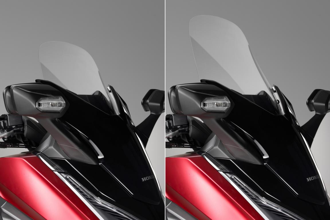Der Forza 125 wurde neu mit einem elektrischen Windschild ausgestattet. Die Verstellung reicht stufenlos über einen 140 mmBereich,